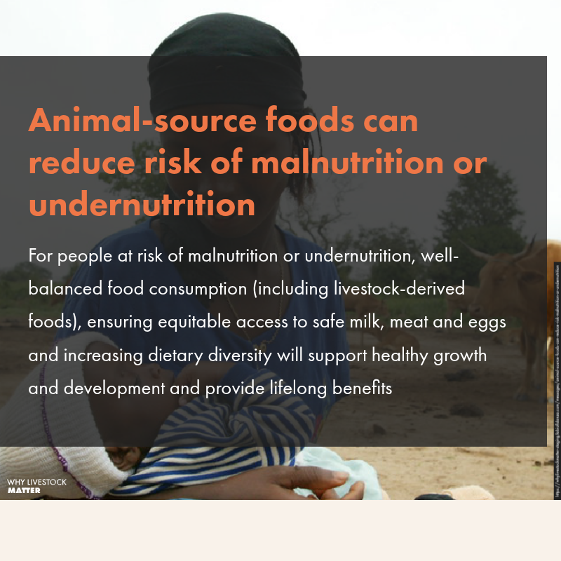For people at risk of malnutrition or undernutrition, well-balanced food consumption (including livestock-derived foods), ensuring equitable access to safe milk, meat and eggs and increasing dietary diversity will support healthy growth and development and provide lifelong benefits