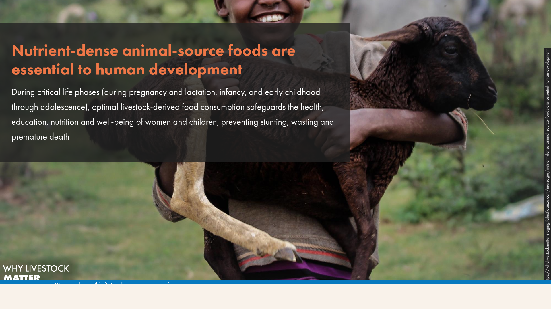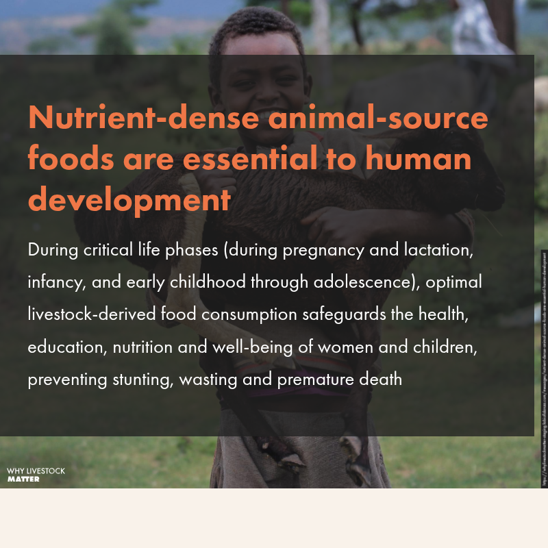 During critical life phases (during pregnancy and lactation, infancy, and early childhood through adolescence), optimal livestock-derived food consumption safeguards the health, education, nutrition and well-being of women and children, preventing stunting, wasting and premature death