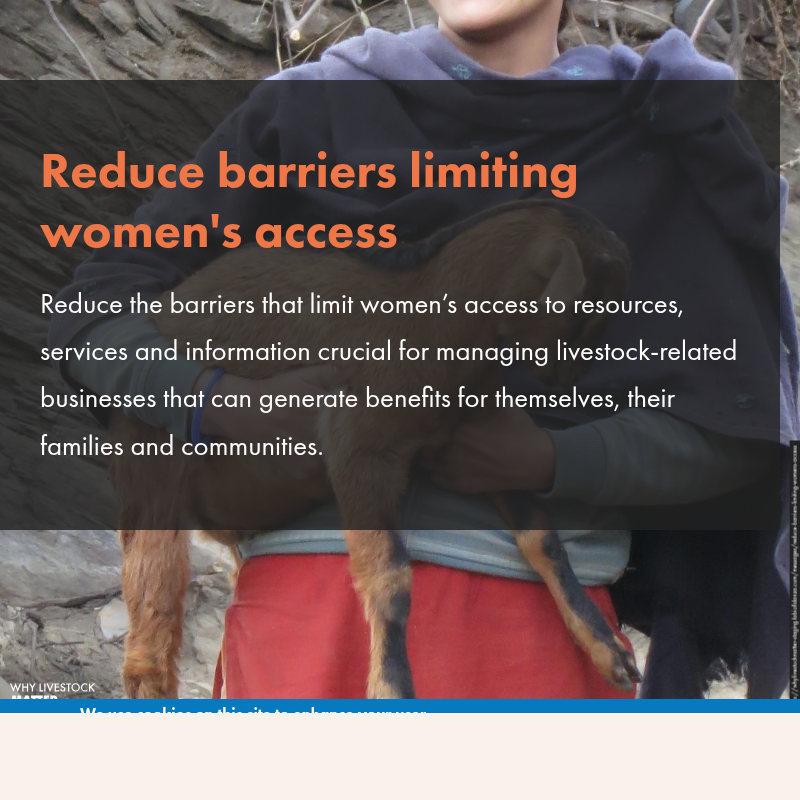 Reduce the barriers that limit women’s access to resources, services and information crucial for managing livestock-related businesses that can generate benefits for themselves, their families and communities.