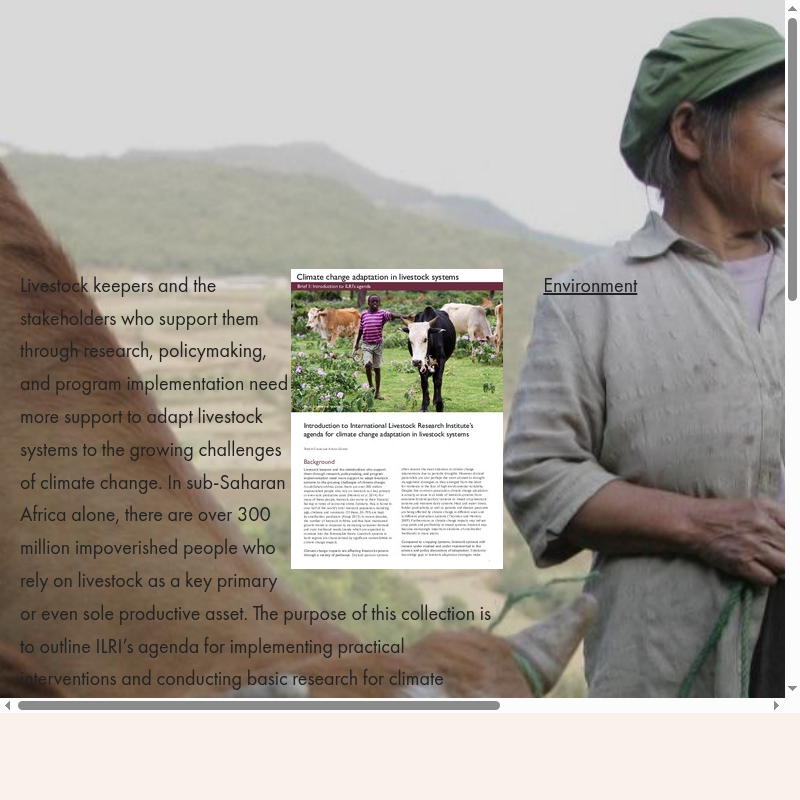 Livestock keepers and the stakeholders who support them through research, policymaking, and program implementation need more support to adapt livestock systems to the growing challenges of climate change. In sub-Saharan Africa alone, there are over 300 million impoverished people who rely on livestock as a key primary or even sole productive asset. The purpose of this collection is to outline ILRI’s agenda for implementing practical interventions and conducting basic research for climate change adaptation in livestock systems in developing countries.