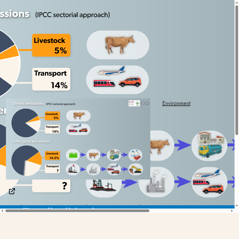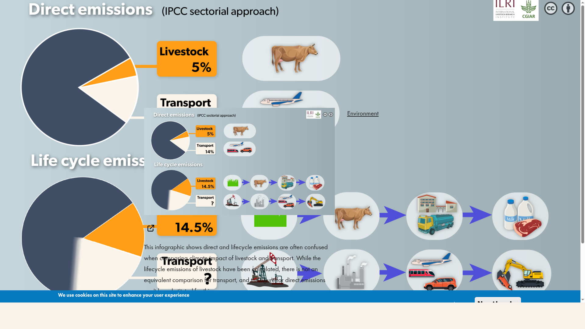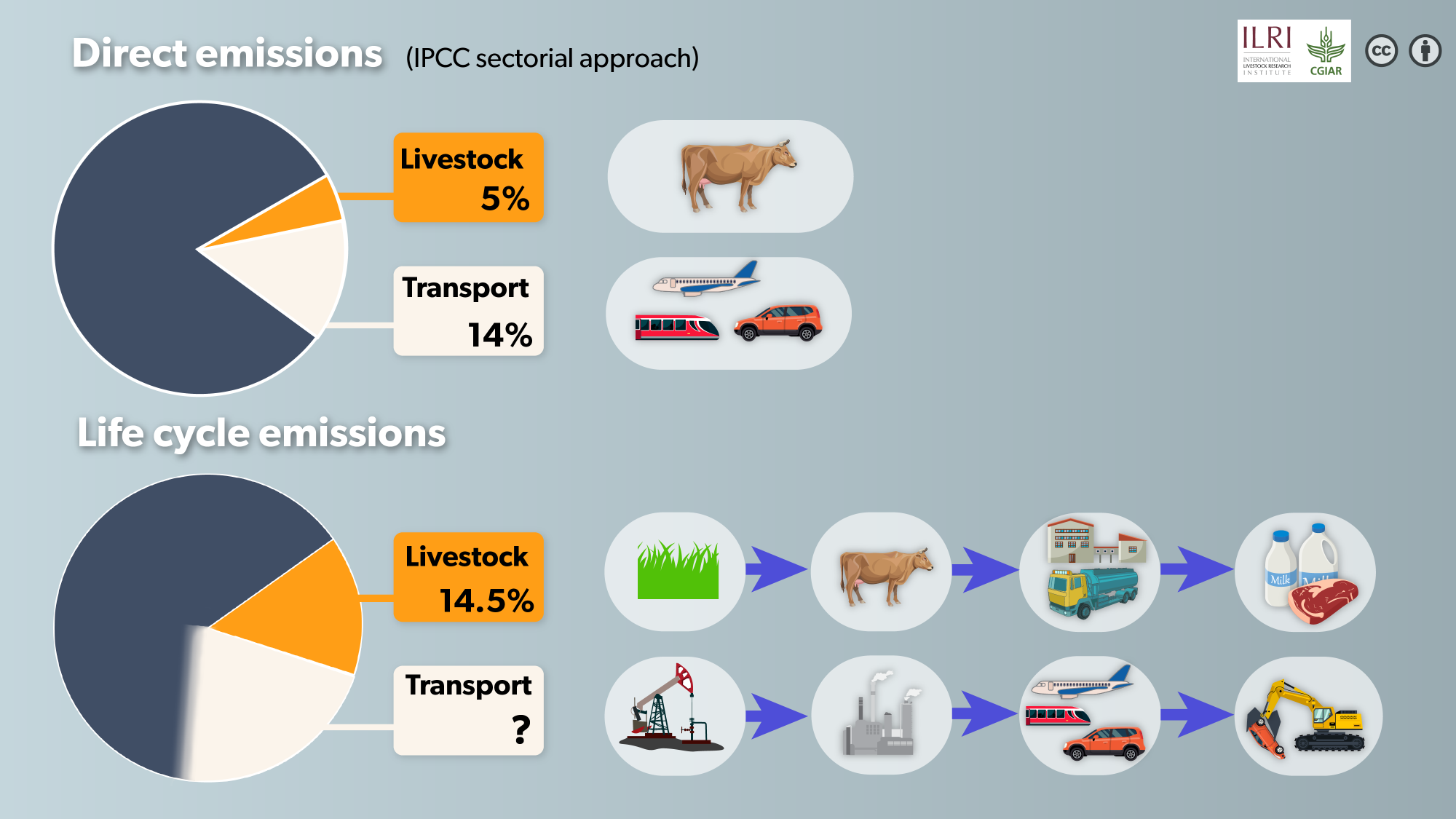 This infographic shows direct and lifecycle emissions are often confused when comparing climate impact of livestock and transport. While the lifecycle emissions of livestock have been calculated, there is not an equivalent comparison for transport, and the figure for direct emissions can't be substituted for this.